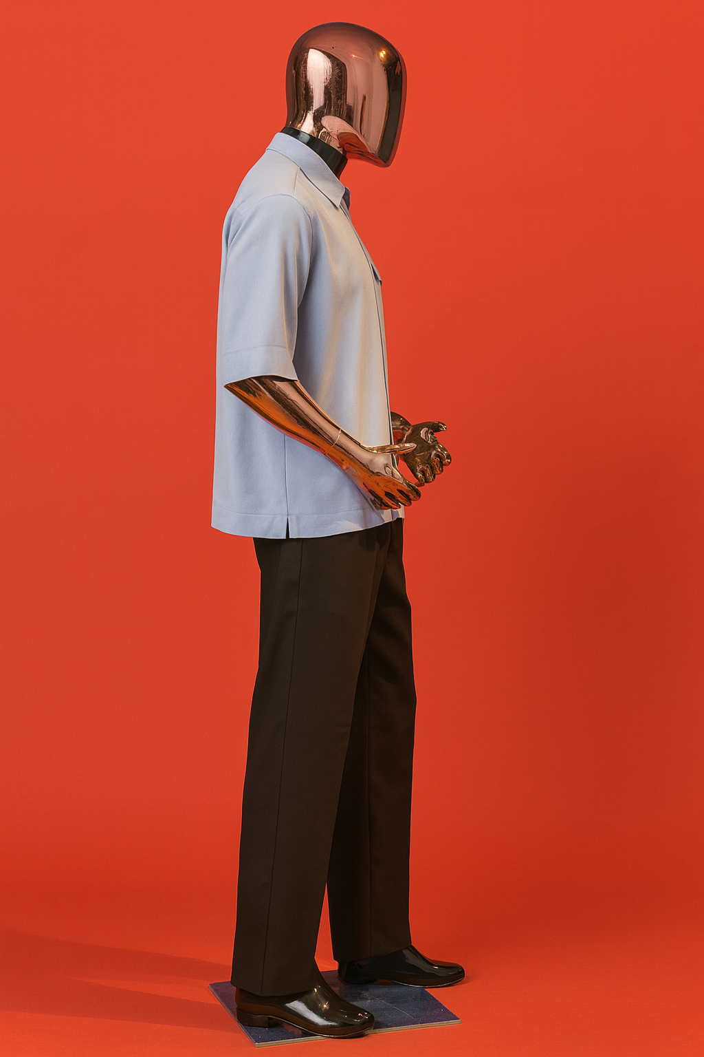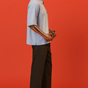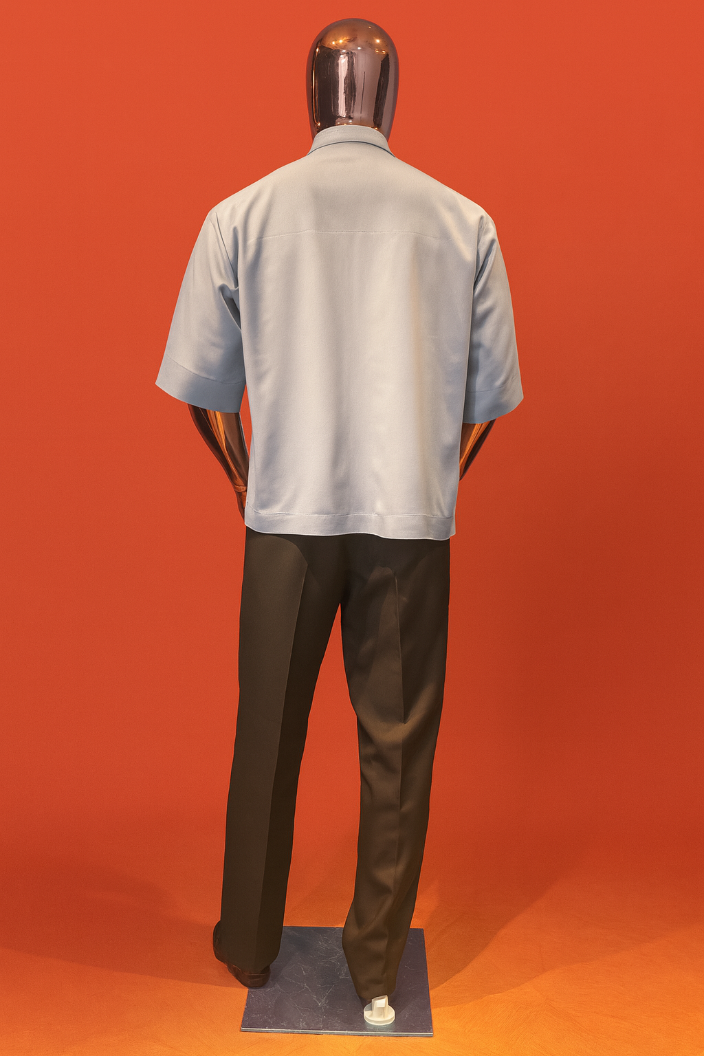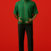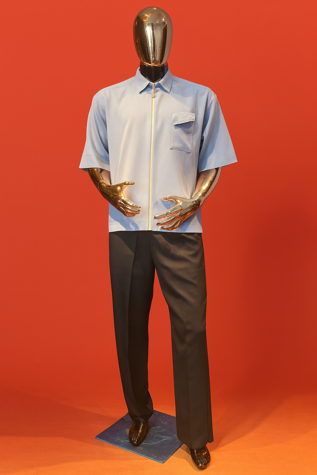 Modern two-piece with a zip-front shirt and tailored black trousers — sleek, versatile, and timeless.