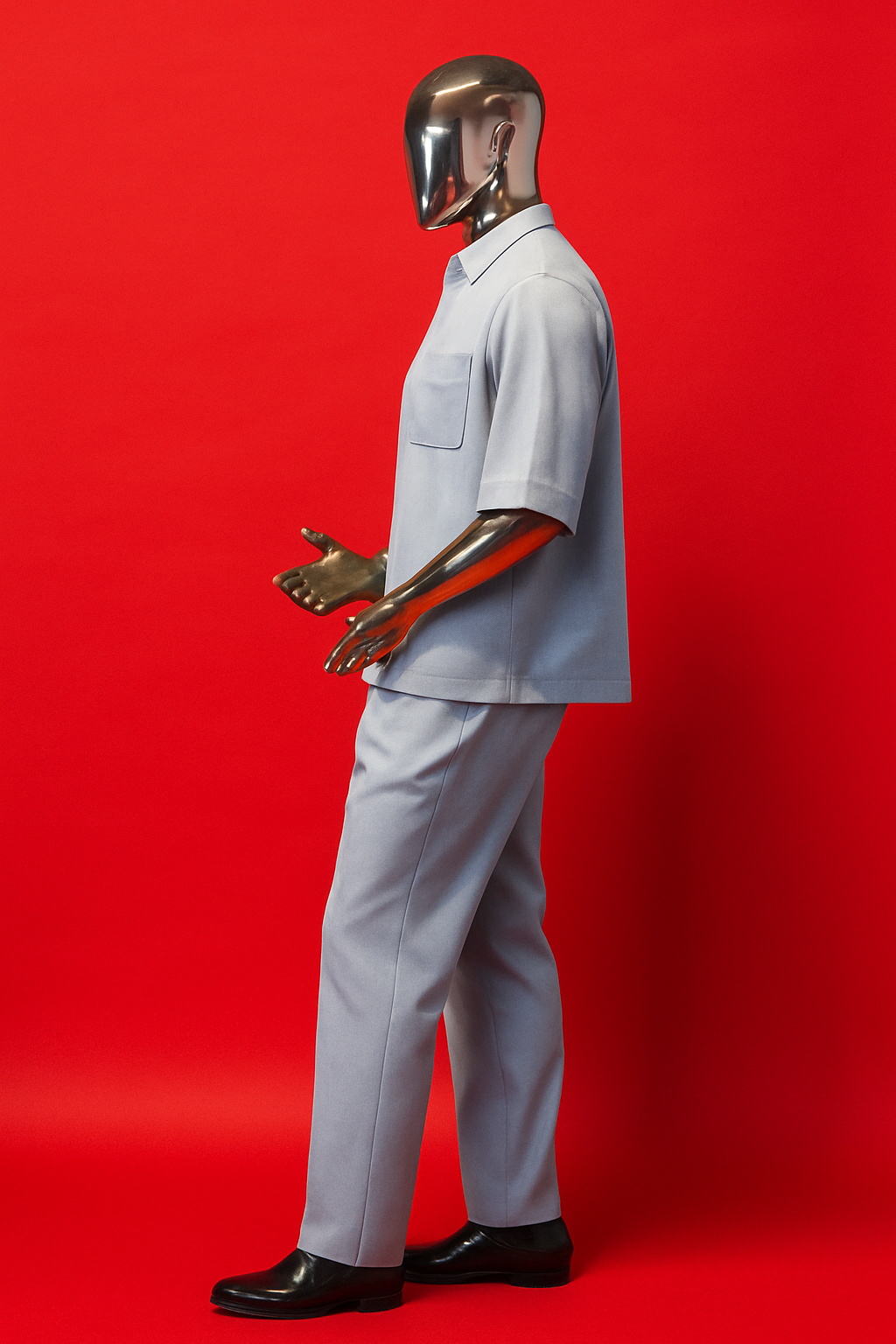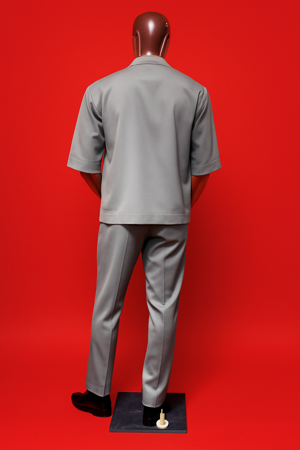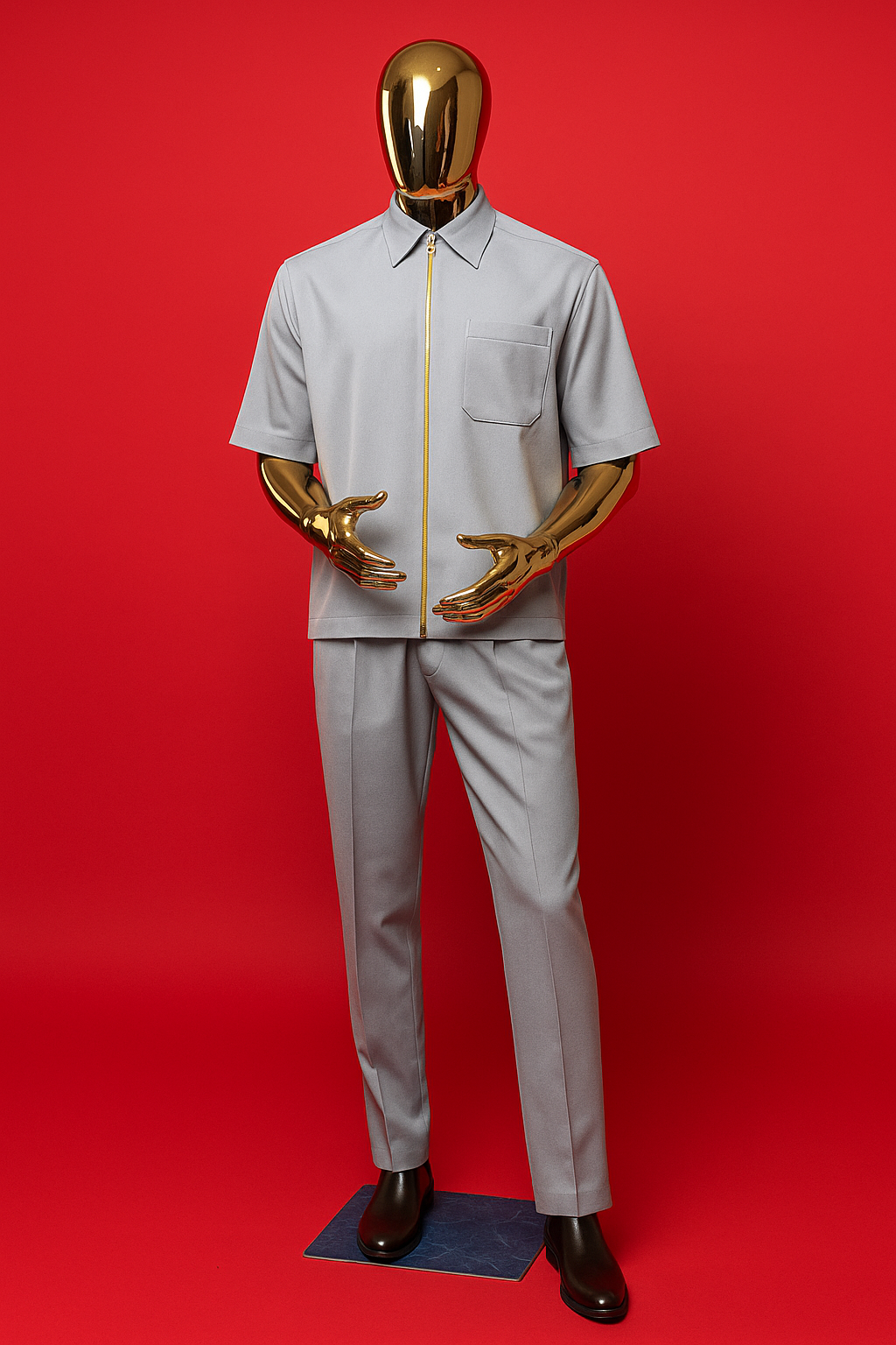 Sophisticated and versatile, this grey crepe two-piece set is crafted for men who appreciate refined minimalism. The short-sleeve zip-front shirt comes with a structured breast pocket, combining functionality with style. Paired with tailored straight-leg trousers, the outfit delivers a sharp yet relaxed fit. Made from premium crepe fabric, it ensures comfort, breathability, and durability while maintaining a polished silhouette. Perfect for both casual outings and semi-formal occasions, this set offers timeless appeal in a neutral shade that pairs effortlessly with any wardrobe.
