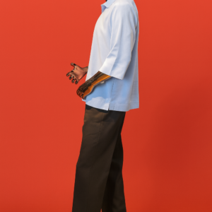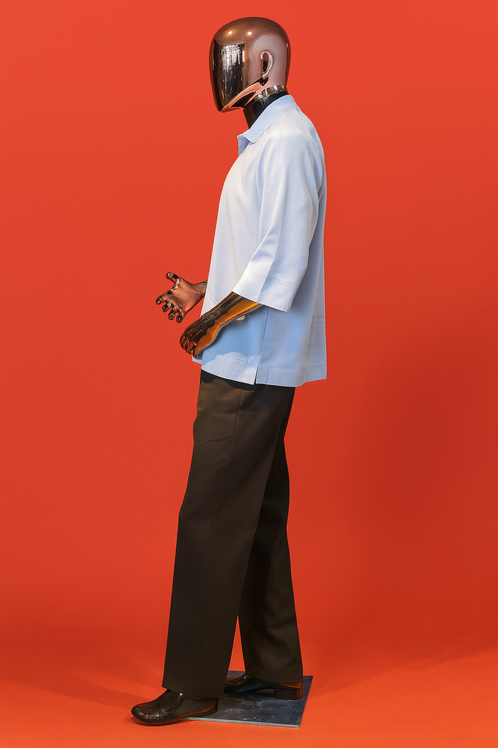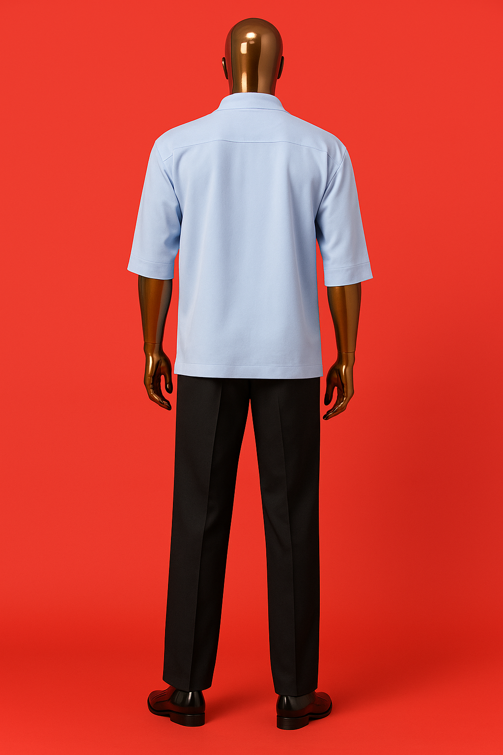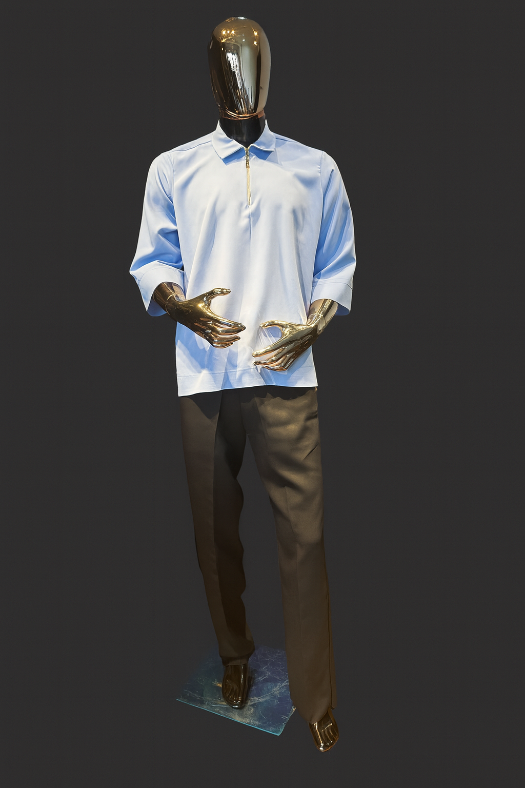 A refined two-piece set designed for modern elegance. The sky blue half-zip crepe shirt features a relaxed fit with mid-length sleeves and a sleek metallic zipper, perfectly balanced for both casual and formal settings. Paired with tailored black crepe trousers, this outfit delivers effortless sophistication. Finished on a bold gold mannequin for a luxury statement, it’s ideal for men who value comfort, class, and confidence.